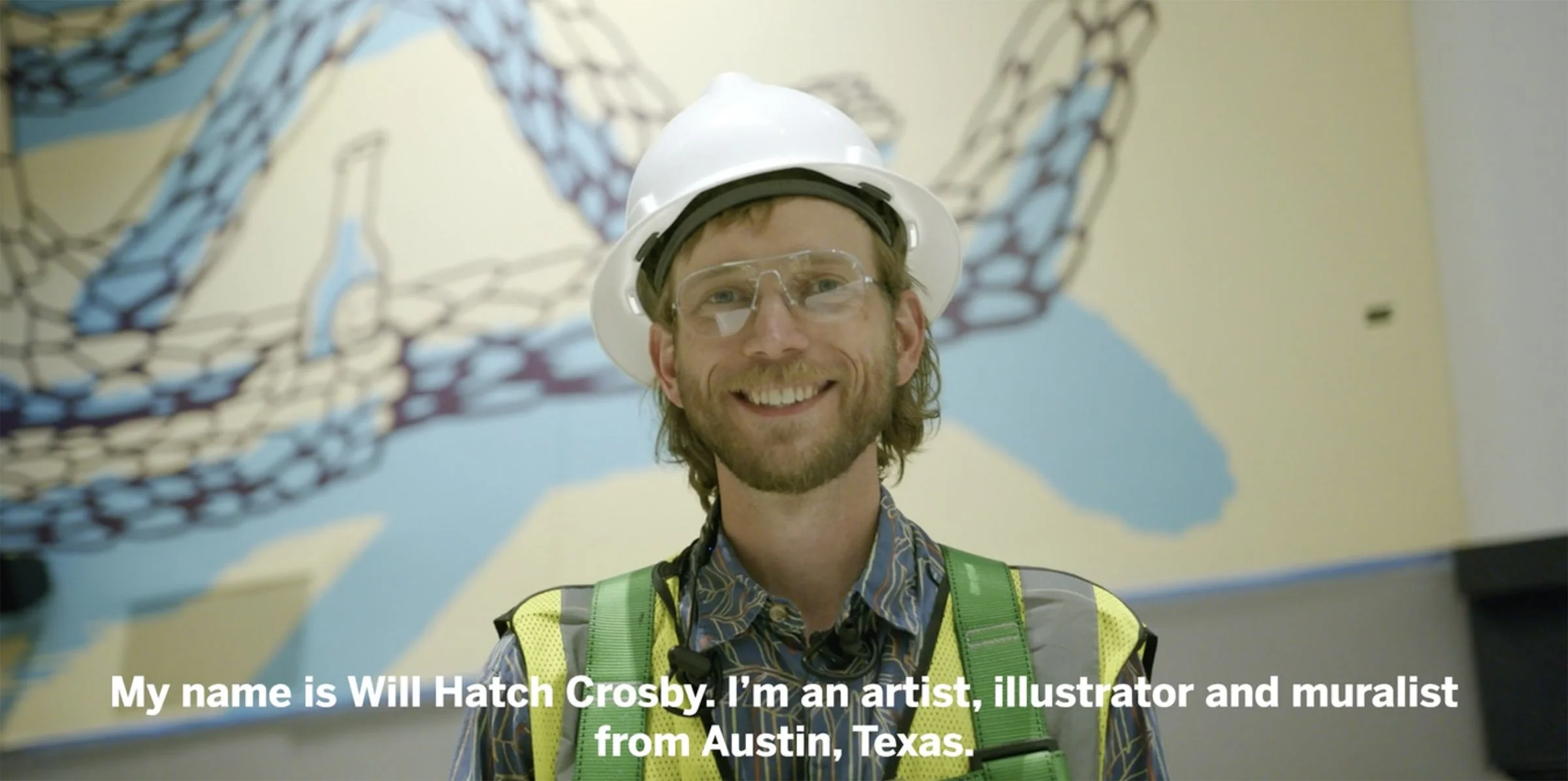 ~1,500 square foot mural at the Moody Center. This longhorn dude serves as a guardian spirit and cultural ambassador for the diverse and creative communities of Austin. Accompanied by the iconic bats of the Congress bridge, the ambassador greets the guests of the Moody Center while having a drink under the shade of an oak tree. The phrase “Hola Friend” serves as a cultural bridge between the Spanish speaking and English speaking communities of Austin - a kind greeting that celebrates diversity.